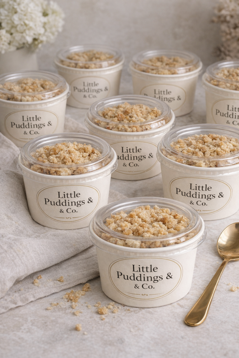 A playful take on a timeless favourite Layer of sponge layers in a rich, fruity jam baked beneath our signature golden crumble, bringing all the warmth and nostalgia of a classic roly poly with a Little Puddings & Co upgrade. Sweet, comforting, and utterly moreish.